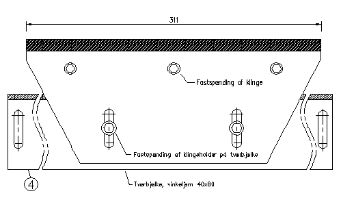 Fastpænd tværbjælken, pos.4, til transportørstativet, således at hårdmetalklingerne pos. l lige netop går fri af båndet. Tryk klingeholderne, pos.2, op, så klingerne trykker let mod båndet i hele klingernes bredde og fastspænd boltene.