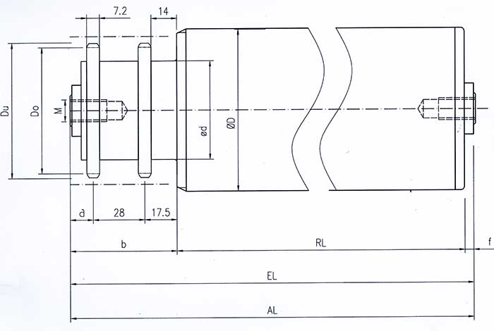 Dreven transportrulle Med dobbelt stålkædehjul for1/2" x 5/16" kæde. Her vist med indvendigt gevind i akslen.
